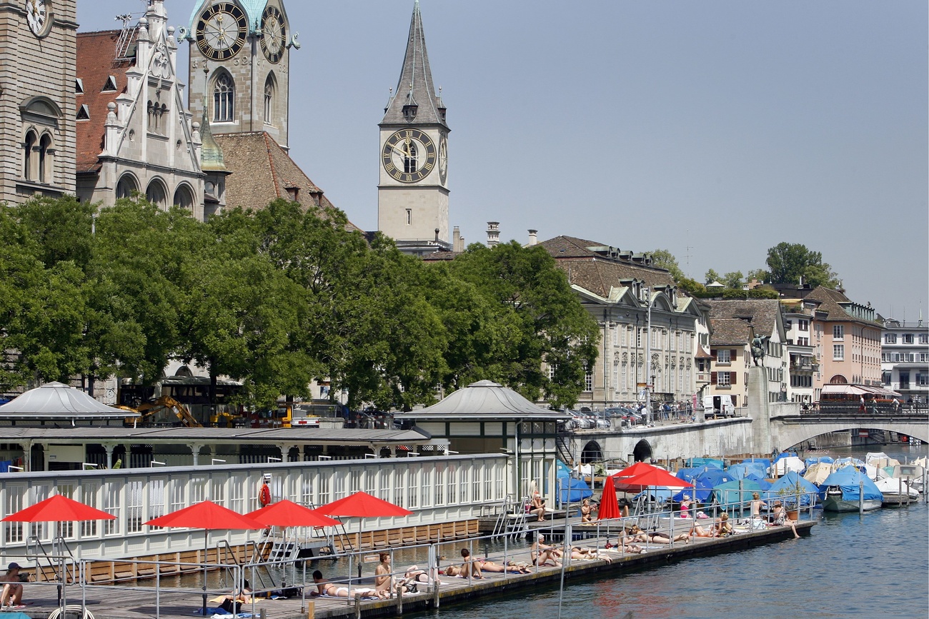 В Цюрихе ситуация иная: на берегу реки Лиммат в женскую купальню, куда мужчинам вход строго воспрещен, ведет небольшой пешеходный мостик, расположенный немного сбоку от собора Гроссмюнстер. Здесь нет отделения для мужчин, смешанного сектора тоже нет, между пальмами и красными зонтиками устроены два бассейна, есть еще пространство с лежаками и небольшое бистро. Вместо дверей в раздевалках висят занавески. Атмосфера спокойная и безмятежная: некоторые женщины читают в тени, другие нежатся топлес на солнце. В это жаркое летнее утро здесь только взрослые, хотя по правилам сюда в сопровождении своих мам допускаются и дети в возрасте до шести лет.