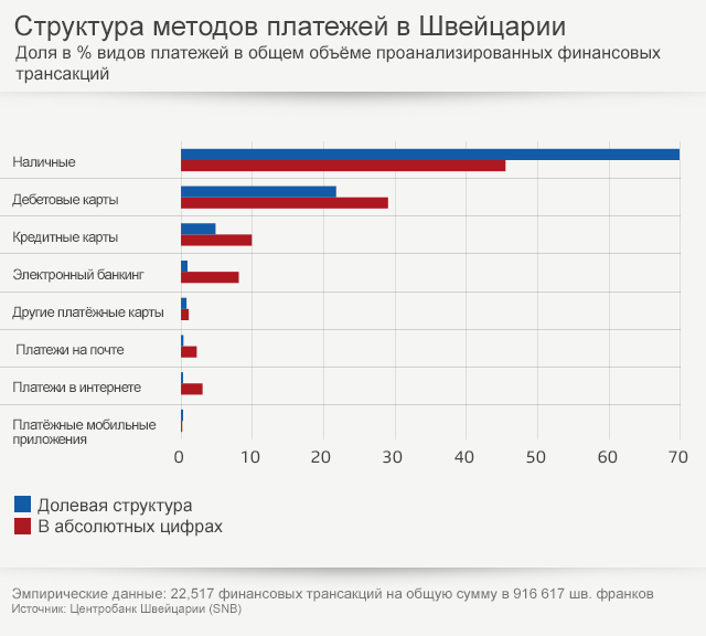 Чтобы составить представление о способах оплаты, Национальный банк предложил 1 968 респондентам вести дневник своих расходов на протяжении недели. Всего было осуществлено 22 689 транзакций на общую сумму 919 305 швейцарских франков, они и стали основой для графика выше. В дневнике отображались как фиксированные, так и разовые расходы в магазинах, в ресторанах, на заправочных станциях и в других местах, где швейцарцам приходилось тратить деньги.