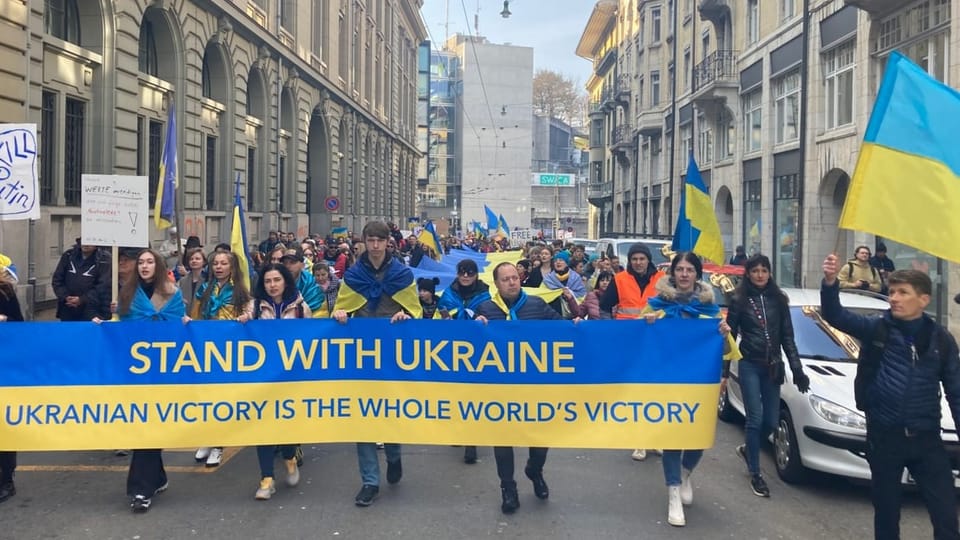 А между тем в Берне в субботу 4 марта, то есть примерно через год после вторжения российской армии в Украину, более тысячи человек провели демонстрацию с требованием, чтобы Швейцария продолжила или даже усилила свою поддержку Украины.