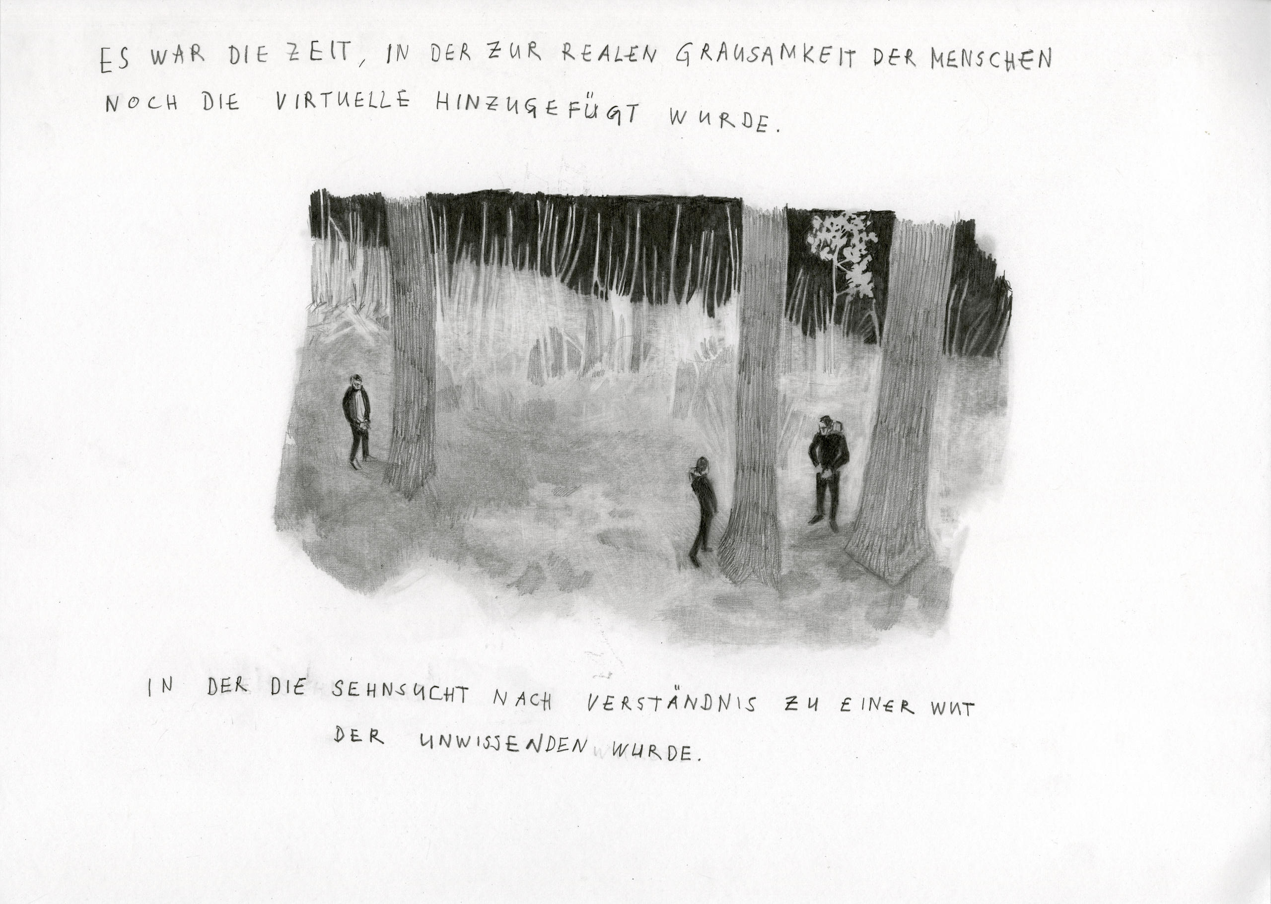 На втором рисунке изображены сражения с зомби, а также сцены пыток, смерти и разрушений, заимствованные с полотна Питера Брейгеля Старшего «Триумф смерти». Ниже представлена серия иллюстраций к отрывкам из довольно плохого, на грани графомании, романа живущей в Швейцарии немецкой писательницы Сибиллы Берг «ГРМ: Мозготрах» (GRM. Brainfuck).