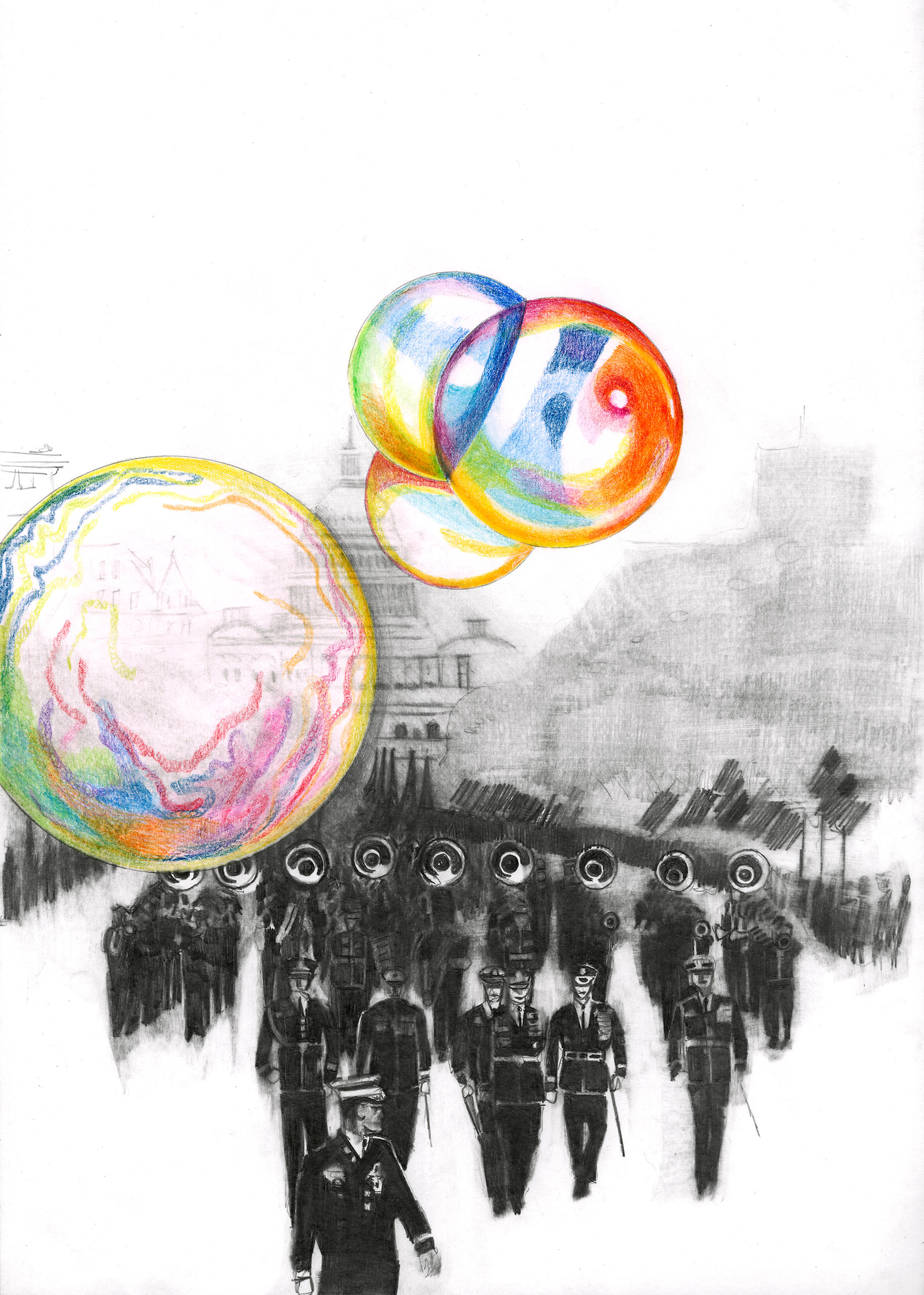 Рисунок пистолета, нарисованный углем на стене у входа во второй зал еще большего размера: он как бы направляет взгляды посетителей в угрожающее будущее − или это уже настоящее? На двух других гигантских настенных рисунках изображено здание Капитолия в Вашингтоне. На одном из них на переднем плане проходит военный парад, а над головой плавают разноцветные мыльные пузыри.