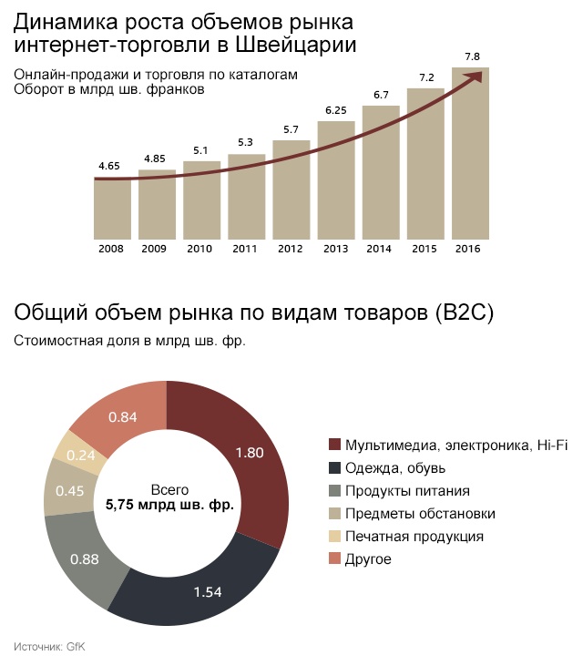 За прошлый 2016 год швейцарские потребители приобрели онлайн товаров на сумму в 7,8 млрд. франков, что на 8,3% больше, чем годом ранее и на 68% больше, чем в 2008 году. В интернете, в частности, было заказано 15% всех непродовольственных товаров, приобретенных швейцарцами за отчетный период, тогда как на пищевые продукты приходится только 2% онлайн-заказов.