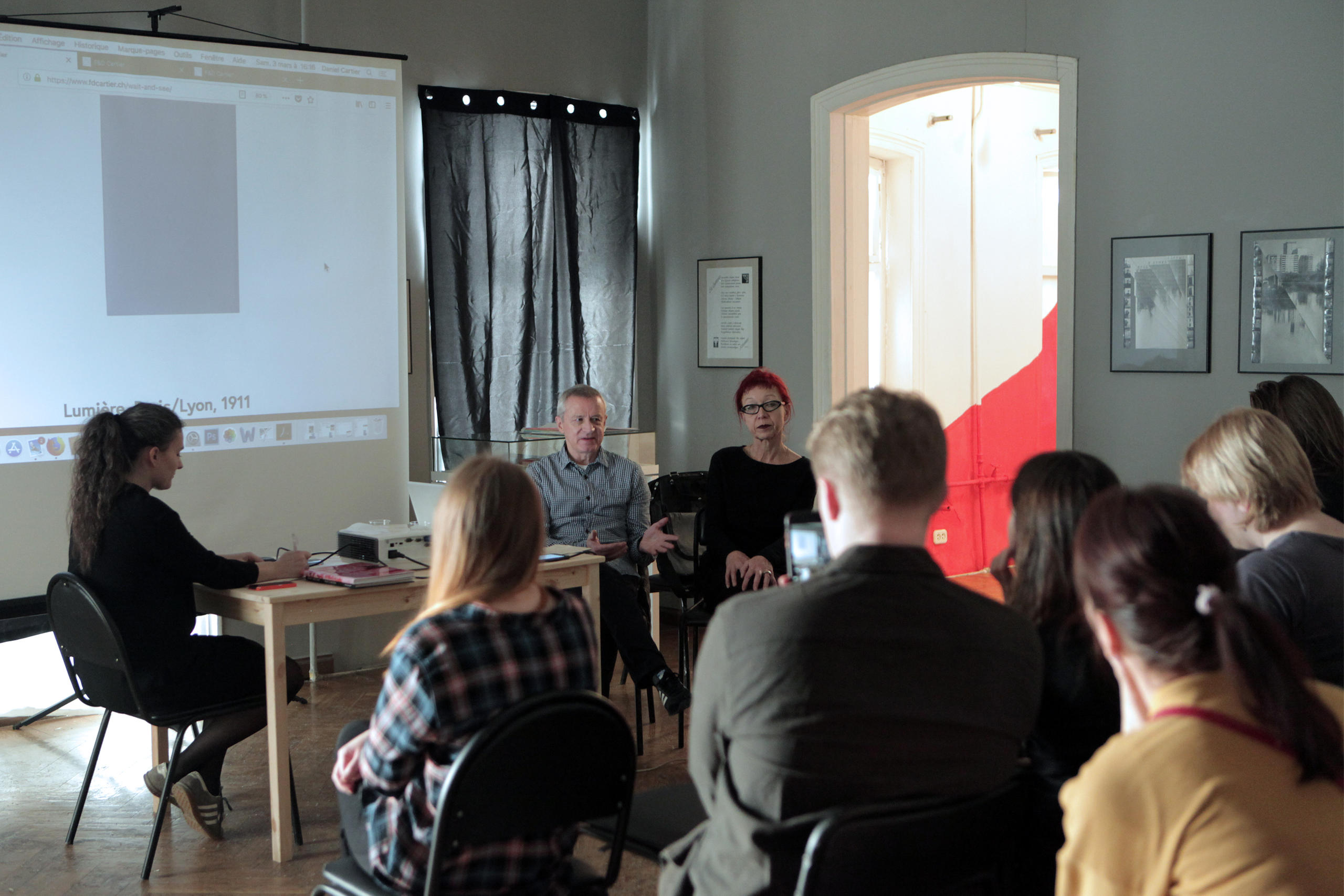 На встрече в «Доме Метенкова» художникам задавали много вопросов. Кому-то хотелось узнать, как супруги Картье относятся к тому, что созданные ими объекты сложно продать. Кто-то интересовался, кем швейцарские гости себя считают — исследователями, фотографами или художниками? Спрашивали и о том, как работы F&D Cartier воспринимает мировое фотографическое сообщество. Франсуаза и Даниэль с удовольствием общались со слушателями. Сразу после лекции они показали, как именно работают с фотобумагой, и какую именно выбирают.