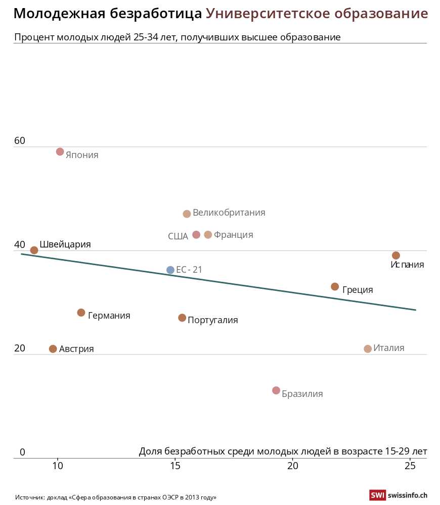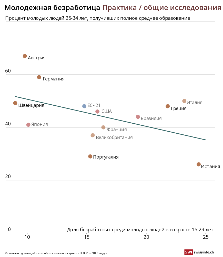Внимательно проанализировав расположенный ниже график, можно, правда, прийти к выводу, что само по себе наличие среднего образования, позволяющего потом либо получить профессию, либо пойти дальше в вуз, слабо коррелирует с уровнем молодежной безработицы. В Австрии, Германии и Швейцарии как минимум половина молодых людей имеют образование на данном уровне. С другой стороны, число таких молодых людей в Италии или Греции практически аналогично, а вот молодежная безработица в этих странах куда выше.