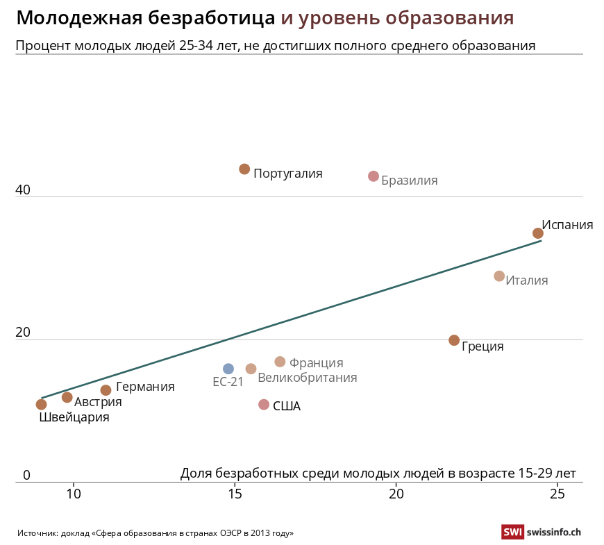 А вот между долей молодых людей, не сумевших получить начального среднего образования, и уровнем молодежной безработицы связь существует, причем довольно очевидная. Швейцария, Германия и Австрия и здесь являются «особым случаем», так как в этих странах число молодых людей, обладающих знаниями на уровне неполного среднего образования, является в европейском зачете минимальным.