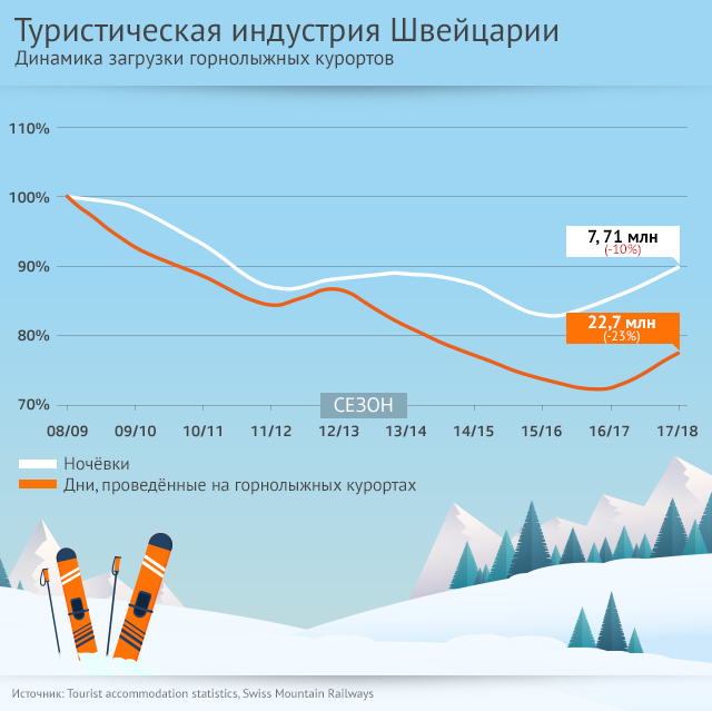 В самом деле, в целом сегодня в Швейцарии число любителей горнолыжного спорта переживает период сокращения. В отчете швейцарского совета по туризму Schweiz Tourismus за 2018 год отмечается, что в период между лыжными сезонами 2008/09 и 2017/18 годов общее сокращение числа человеко-дней, проведённых на лыжных курортах в Швейцарии, составило 23% и что эта тенденция вполне отражает общую мировую ситуацию.
