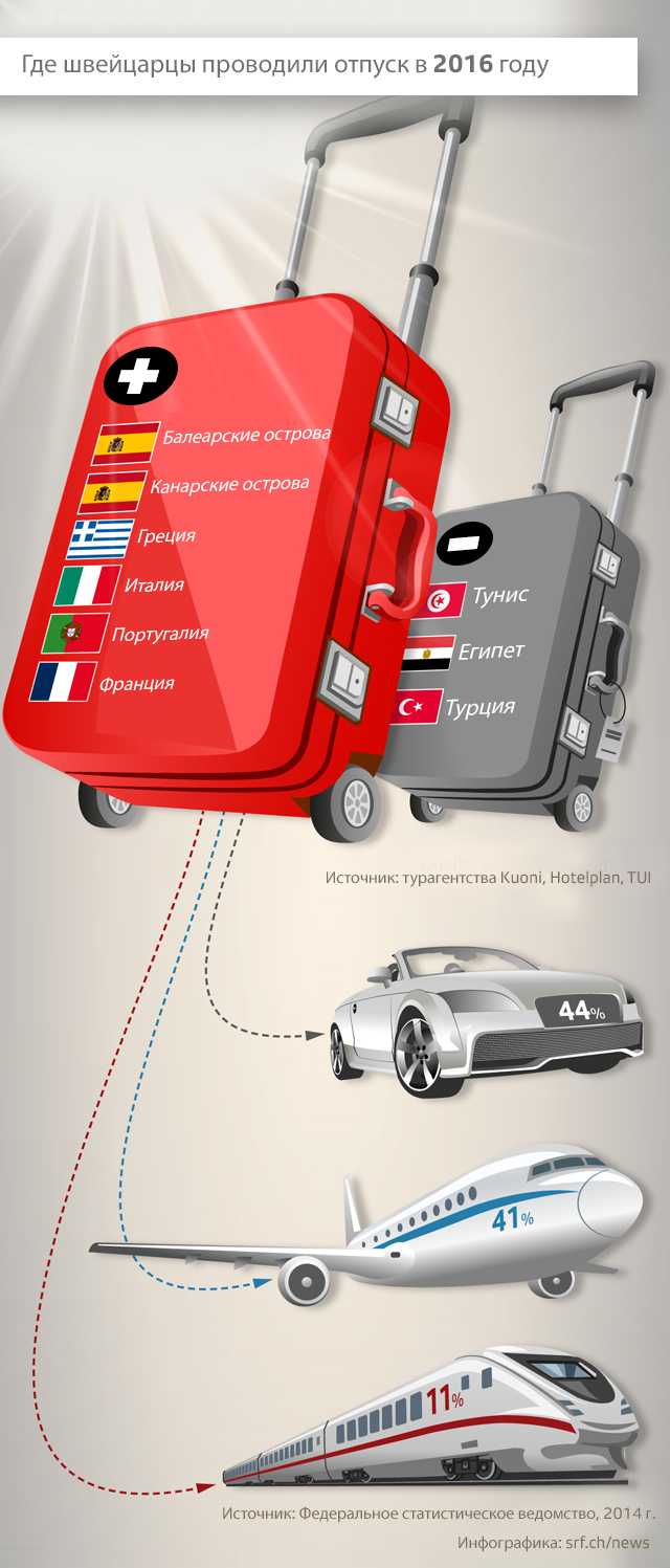 СтатистикаВнешняя ссылка также говорит о том, что швейцарцы теперь куда реже отправляются проводить отпуск в страны и регионы, которым угрожает терроризм (Тунис, Египет и Турция), предпочитая европейские направления, в частности, Пиренейский полуостров и Балеарские острова.