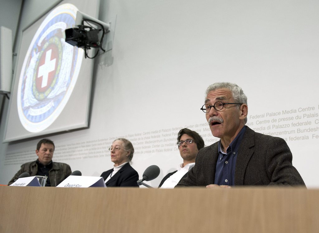 Кампания за проведение референдума по вопросу о введении в Швейцарии базового дохода для всех началась 12 апреля 2012 г., референдум по ней пройдет 5 июня 2016 года. На снимке: члены инициативного комитета Даниэль Хенни, Урсула Пифаретти, Кристиан Мюллер и Освальд Зигг в Берне, 12.04.2012 г. Keystone