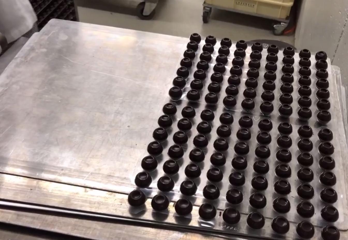 Однако пустые пространства и несколько остановленных конвейерных лент свидетельствуют о том, что фабрика работает не на полную мощность. «Это потому, что мы еще не вышли на пиковые показатели производства, которые обычно приходятся на период с октября до Пасхи, и достигают максимума в период Рождественских праздников. Но сейчас часть сотрудников продолжает работать, чтобы осуществлять поставки в магазиины», — говорит директор по маркетингу, указывая на группу из шести женщин, расположившихся у большого стола. Они берут шоколадные трюфели с начинкой и покрывают их слоем из нуги в форме полумесяца, в результате чего получается конфета, похожая на каштан.