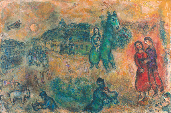 Дороже всего, в 2,5 млн. швейцарских франков, оценена картина «Деревня во время праздника», написанная в технике пуантилизма в 1981 году, когда Шагалу было уже 94 года. Она отличается не только своим монументальным размером — 130 на 195 см — но и огромным множеством мотивов и персонажей. По полотну можно «идти», как по дороге, от одного героя к другому, либо рассматривать его словно фильм, отражающий объединенные личным опытом и воображением мастера события целого столетия.
