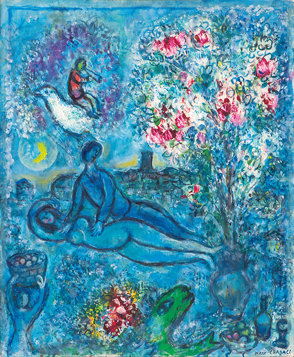 Синий цвет доминирует и в картине «Новобрачные в небе Парижа» (1976 г., предварительная оценка — 1,25 млн. франков). Сквозь слои светящейся масляной краски угадываются путеводные мотивы всей жизни Шагала: Эйфелева башня, Париж и Витебск, петух, лошадь, цветочный букет. Все эти символы мы неоднократно встречаем на страницах аукционного каталога.