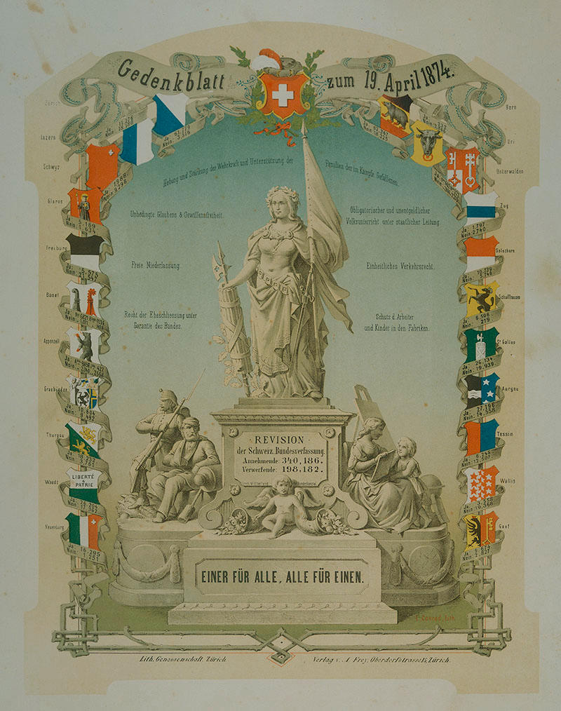 Памятная гравюра в честь Первого общего пересмотра Федеральной конституции Швейцарии в 1874 году. Musée national suisse
