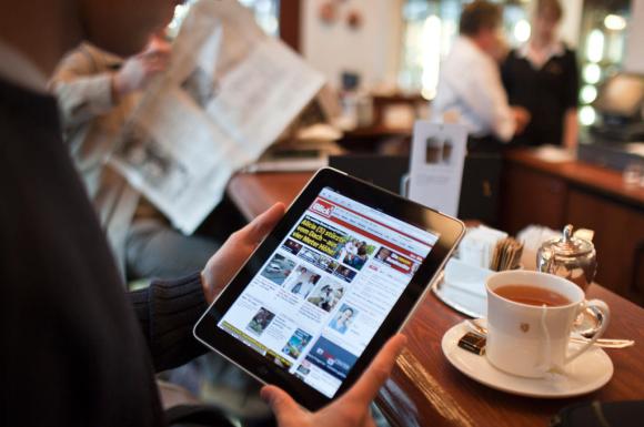 Man holding iPad, reading news, in a cafe