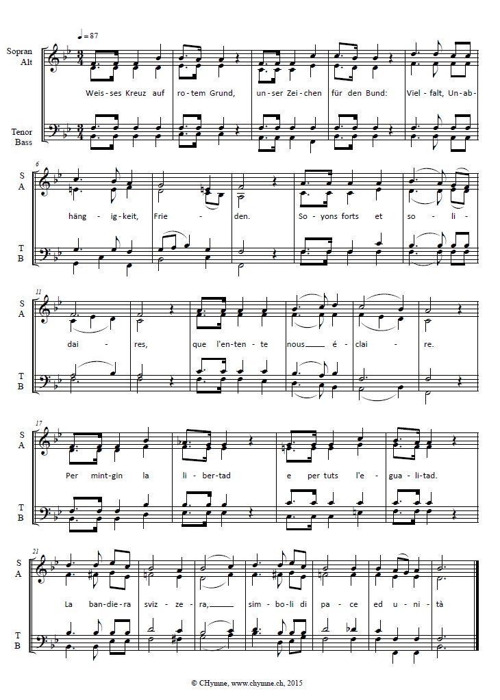 По условиям конкурса, текст гимна должен был быть написан как минимум на одном национальном языке страны. Победивший вариант был поочередно спет Швейцарским молодежным хором (Schweizer JugendchorВнешняя ссылка) на немецком, французском, итальянском и ретороманском языках, то есть на национальных языках страны (официальных языков в Швейцарии на федеральном уровне только три — те же, минус ретороманский).