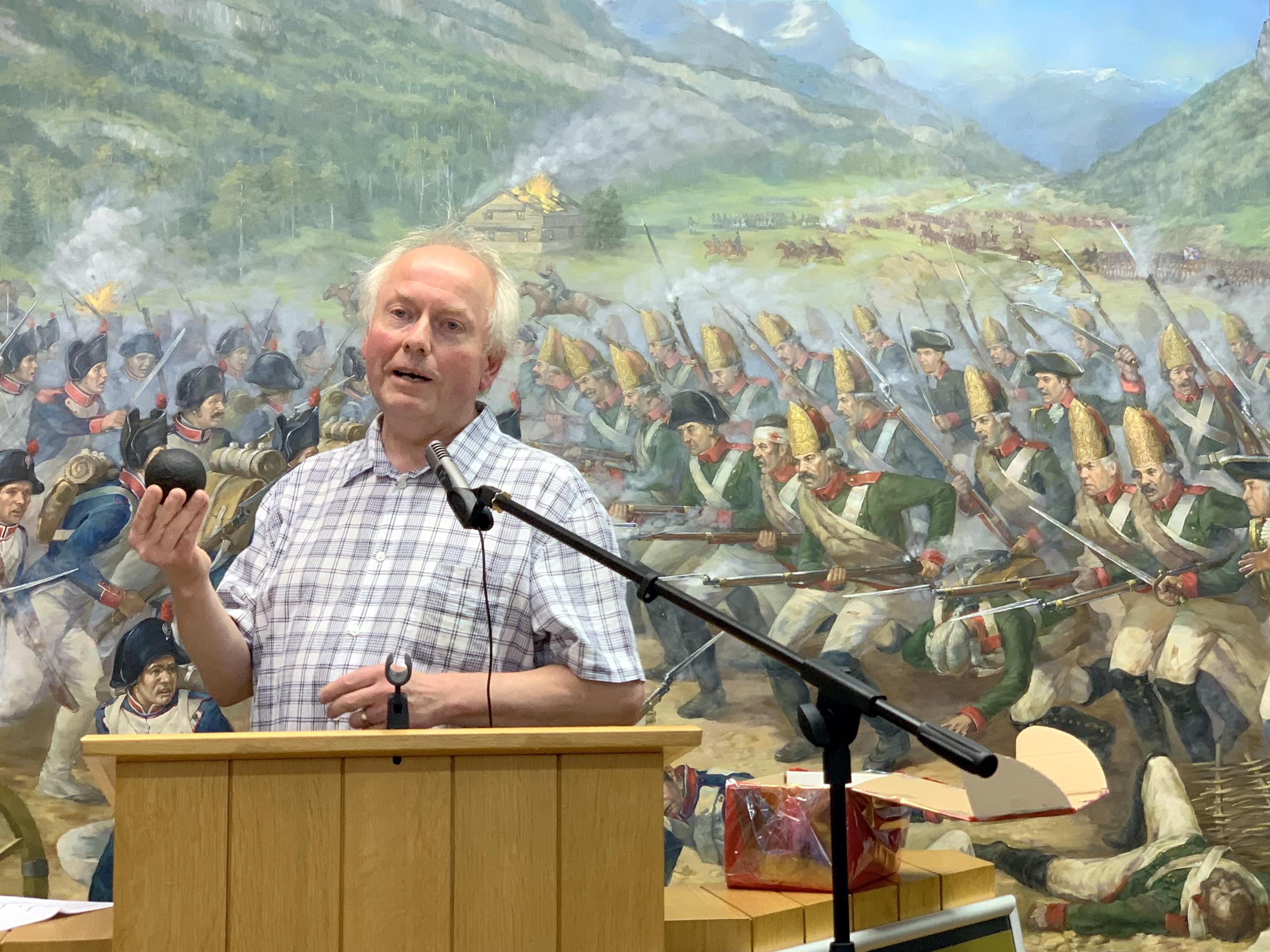 Несколько лет назад увидел репортаж российского телевидения про музей А.В. Суворова в Линтале и решил помогать швейцарскому «суворовцу». «Вальтер стал моим учителем. С 2015 года я участвую в восстановлении храма и родового поместья А.В. Суворова в селе Кистыш в России, там также планируется создание музея. Вальтер — настоящий энтузиаст и подвижник изучения памяти А.В. Суворова, его опыт бесценен!», — отметил Василий Верещак в своем выступлении во время праздничных мероприятий на прошлой неделе в музее, поблагодарив Вальтера за всего многолетние усилия по созданию Суворовского музея. Он также подарил музею современные литографии, посвященные Швейцарскому походу 1799 г., а от российского посольства в дар музею была передана уменьшенная копия картины В. Сурикова «Переход Суворова через Альпы». Именно эти суровые Альпы окружают городок Линталь, их высоту и неприступность можно увидеть, выйдя из музея.