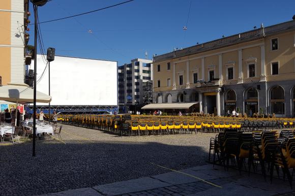 Площадь Piazza Grande готовится к очередному вечернему кинопоказу.