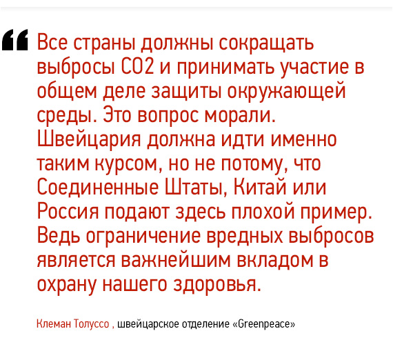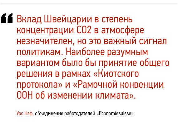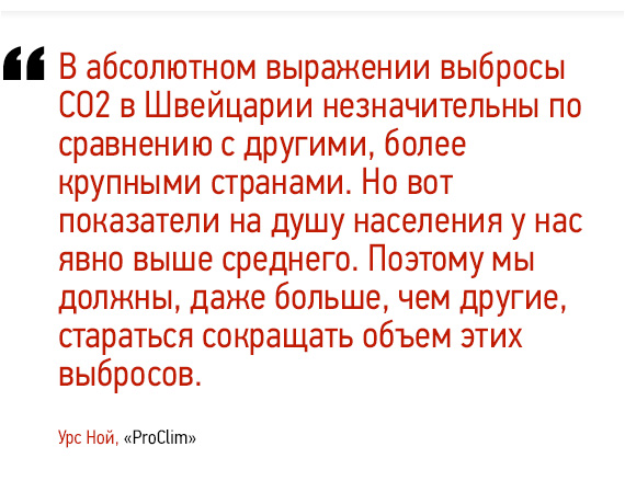 «Если мы хотим убедить международное сообщество в целесообразности ведения скоординированной политики, то Швейцария должна решительно сокращать свою эмиссию СО2, четко информируя мир о принятых ею политических решениях», — подчеркивает Урс Нэф (Urs Näf), отвечающий за вопросы энергетики и экологии в швейцарском межотраслевом объединении работодателей «Economiesuisse».