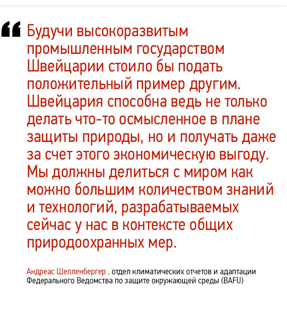 По мнению Андреаса Шелленбергера (Andreas Schellenberger), руководителя Отдела климатических отчетов и адаптации швейцарского Федерального ведомства по защите окружающей среды (BAFU), Конфедерация может похвастаться замечательной и высокоразвитой наукой. «Научные знания, технологические возможности, финансовые средства — все это у Швейцарии есть в достатке, а потому она, наряду с другими странами, должна полностью взять на себя свою долю ответственности с тем, чтобы внести свой вклад в сокращение объемов выброса углекислоты», — указывает чиновник.