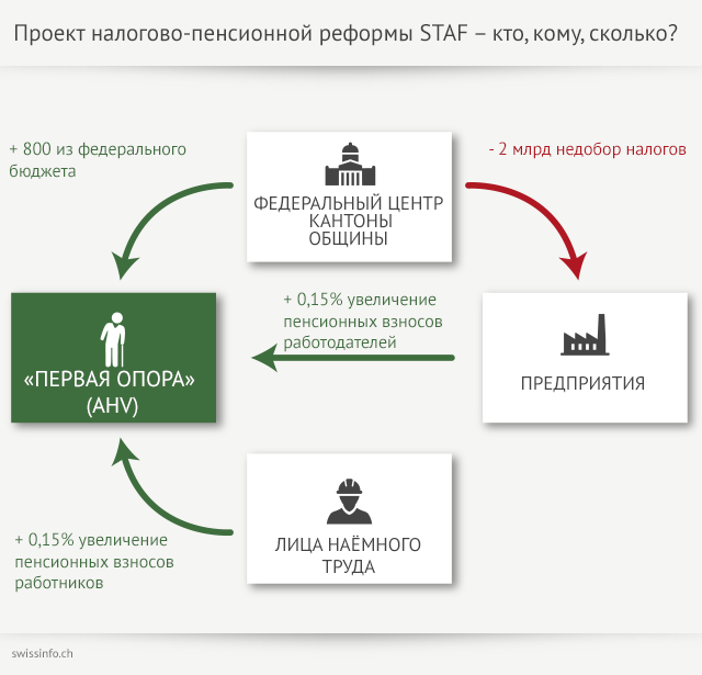 Пакет STAF предусматриваетВнешняя ссылка внесение поправок сразу в целый ряд законодательных актов, регулирующих те или иные аспекты финансирования пенсий AHV. Предполагается, что в результате реализации этих поправок в доход пенсии по линии «первой опоры» поступят дополнительно 2 млрд франков, в частности за счет повышения отчислений в бюджет «первой опоры» со стороны государства и со стороны работодателей, то есть тех, кто, собственно, и формирует в Швейцарии пенсию AHV. Некоторые «жертвы» потребуются также и от работников.