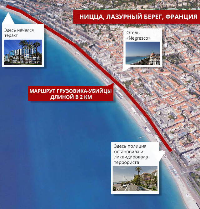 Примерно в 23.00 по местному времени большой белый грузовик врезался в толпу на Английской набережной в Ницце. Тысячи людей собрались здесь, чтобы посмотреть на фейерверк, традиционно устраиваемый 14 июля, в день национального праздника Франции. В сообщениях СМИ говорится, что водитель грузовика, 31-летний выходец из Туниса, гражданин Франции Мухаммед Булель, еще и открыл огонь из автоматического оружия.