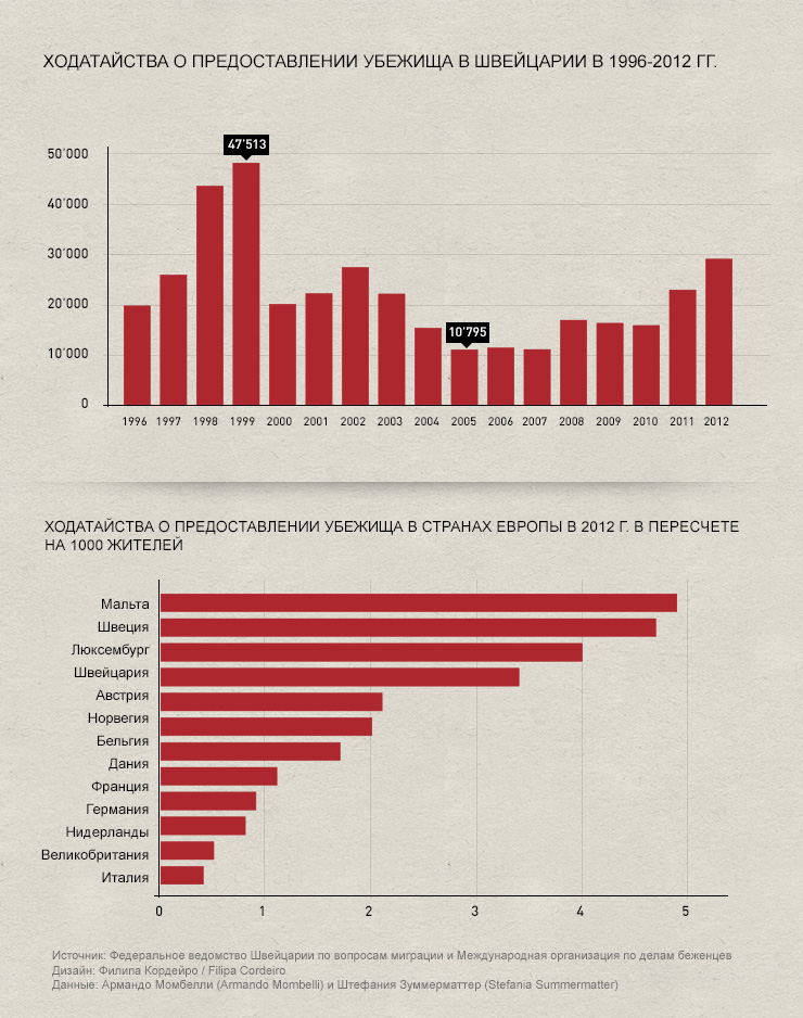 В 2012 году в Швейцарии таких ходатайств было подано 11 029, из низ 6 605 человек уже подавали ходатайства на получение убежища в Италии, 824 – во Франции, 675 – в Германии, 563 – в Австрии.
