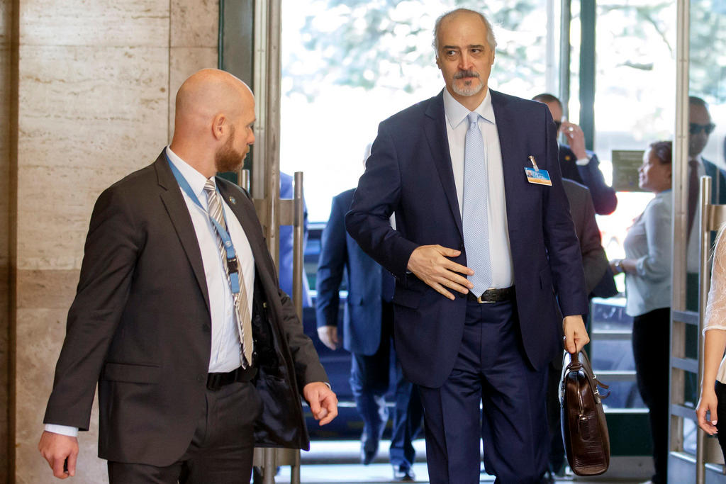 Посол Башар аль-Джафари (Baschar al-Jafari, справа), представитель правительства Сирии, по прибытии в Женеву. Keystone