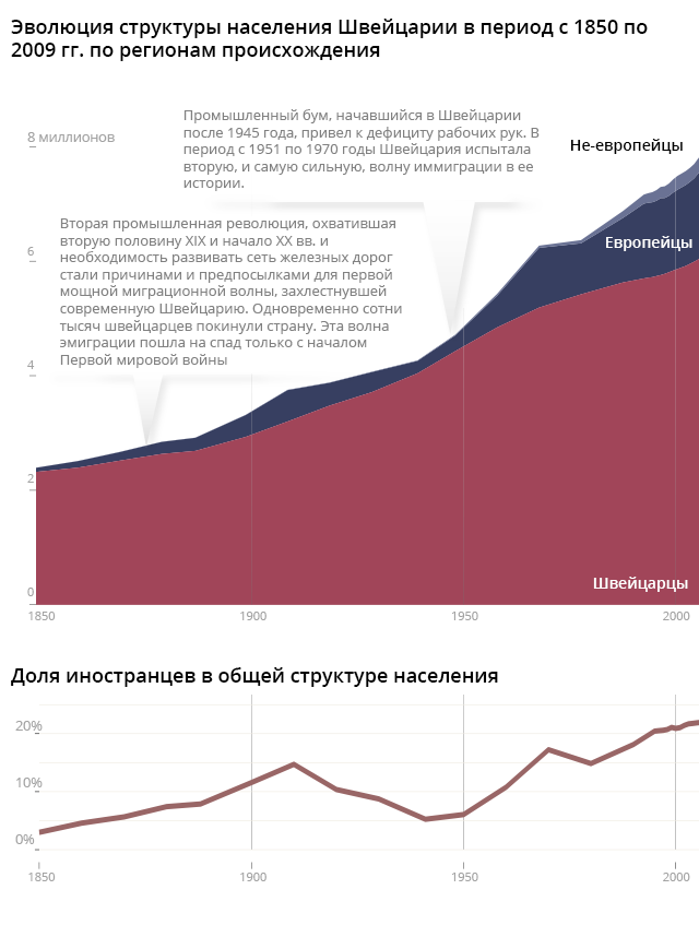 Другими словами, коренное население Швейцарии сокращается, и если бы не миграция, которая сейчас не только компенсирует низкую рождаемость, но и обеспечивает возможность численного роста общего населения страны, Швейцария так бы и оставалась страной нетронутой природы с немного странными обитателями. А так за счет притока иностранцев к «этим странным швейцарцам» сейчас активно добавляются порой столь же странные пришельцы из-за рубежа — но это уже иная история.