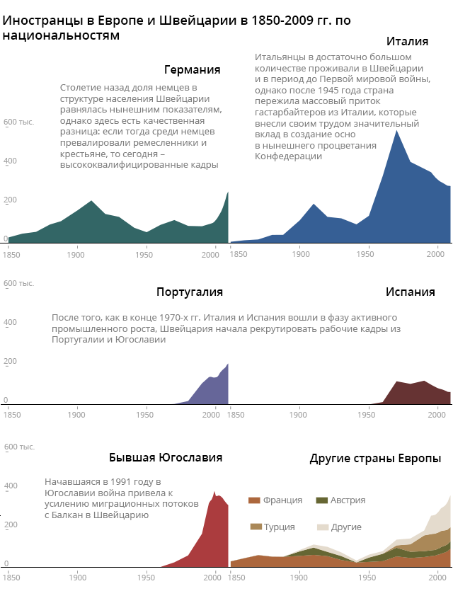 Следует учитывать, что швейцарское законодательство не предусматривает права получения гражданства только по факту рождения на территории страны. По состоянию на 2013 год 83% проживающих в Швейцарии иностранцев были родом из стран ЕС. Следующий график показывает, что иммиграция из Германии, Италии, а также, в меньшей степени, из Франции имеет свои глубокие исторические корни.