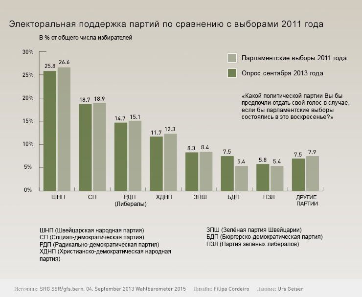 Напомним, что в настоящее время в Федеральном совете работают по два представителя от партии социалистов и либералов («SP», «FDP»), и по одному министру от «народников» («SVP»), демохристиан («CVP») и «Бюргерско-демократической партии» («BDP»).