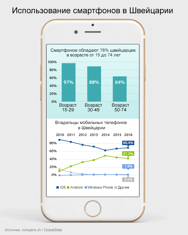 Он очень много может рассказать о том, к каким ухищрениям вынуждены были прибегать те, кто хотел провести со своим телефоном «джейл-брейк». Сегодня ничего такого делать уже не надо, телефоны от «Эппл» попадают в Швейцарию вполне оперативно и легально, а операционная система iOS занимает на рынке Конфедерации неизменно устойчивую и довольно солидную нишу.