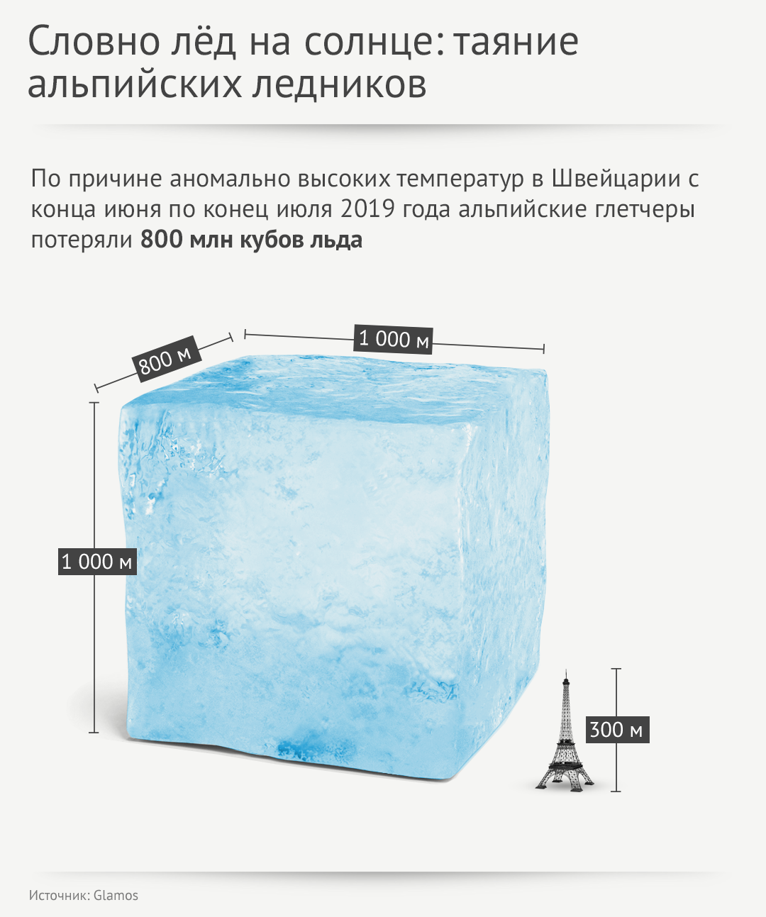 Только за 14 дней жары альпийские ледники потеряли около 800 млн тонн снега и льда, что эквивалентно объёму питьевой воды, потребляемому населением Швейцарии (8,5 миллиона человек) за год. Об этом сообщил на своей странице в сети Twitter Матиас Хусс (Matthias Huss), глава Швейцарской сети мониторинга ледников (GlamosВнешняя ссылка). Этот объем можно примерно уложить в куб изо льда, высота которого в три раза больше, чем высота Эйфелевой башни в Париже.