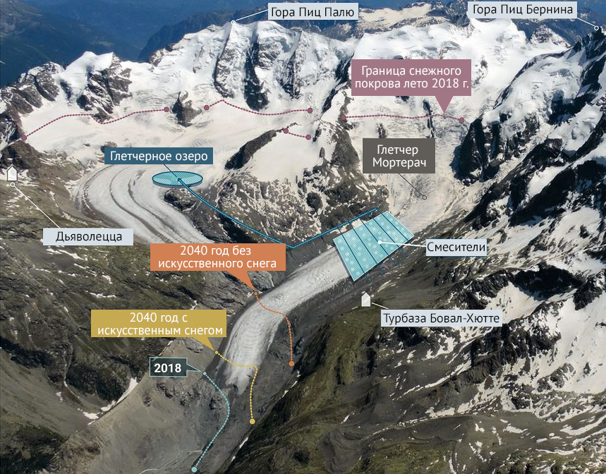 Проект по нанесению на глетчер Мортерач (Morteratsch-Gletscher) в кантоне Граубюнден покрова из искусственного снега. Авторы проекта рассчитали два сценария развития глетчера до 2040 года с искусственным снегом и без него. HTW Chur