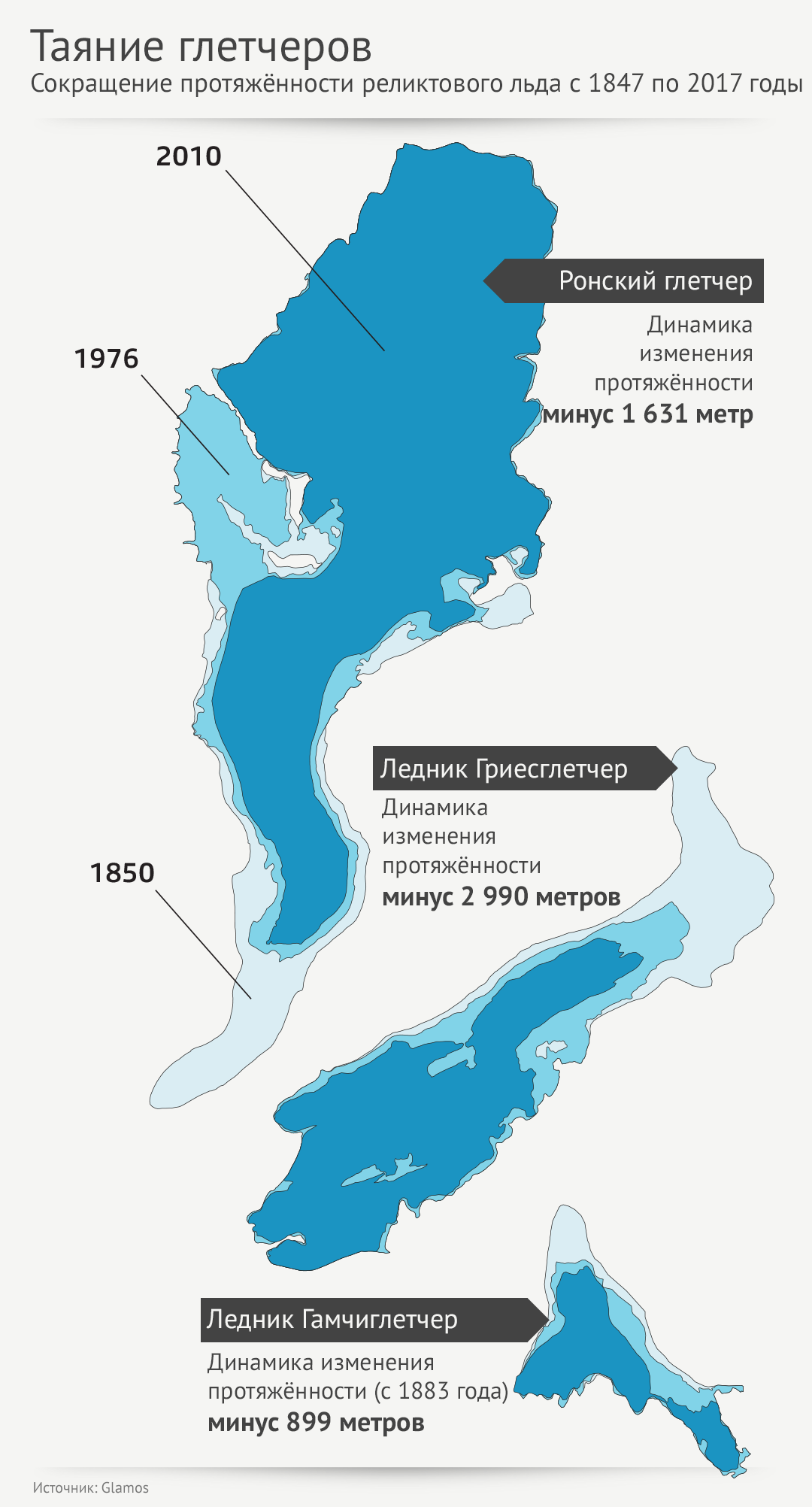 Такой выводВнешняя ссылка, по крайней мере, делается в докладе по итогам исследования, проведенного Швейцарской высшей технической школой Цюриха (ETHZ) и Федеральным научно-исследовательским институтом леса, снега и ландшафта (WSL). Ученые предупреждают, что если не предпринимать меры для сокращения выбросов парниковых газов, то к концу столетия все ледники в Швейцарии и в Европе могут почти полностью растаять.