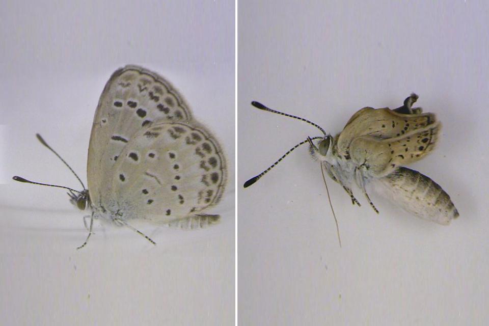 Слева: нормальный экземпляр бабочки-голубянки (лат. Lycaenidae), справа мутировавший экземпляр с угнетенным развитием крыльев и дополнительным усиком (антенной). Keystone
