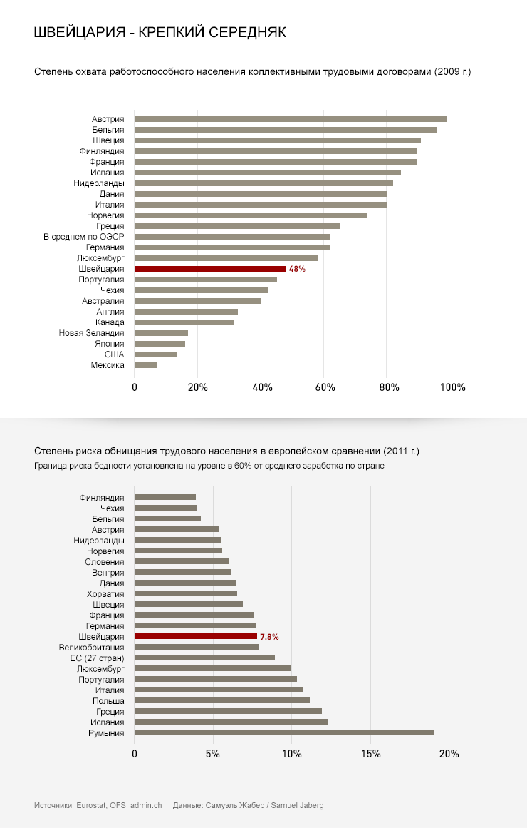 И.Ф.: Безусловно. Ведь основная проблема, если смотреть на ситуацию с федерального уровня, заключается в том, что теоретический единый уровень МРОТ действовал бы на территории очень разных по своему уровню развития и по стоимости жизни регионов. Решение, предлагаемое кантоном Юра, в этом смысле было бы гораздо более простым и адекватным, оно бы учитывало как особенности регионов и отраслей, так и практику заключения коллективных трудовых договоров.