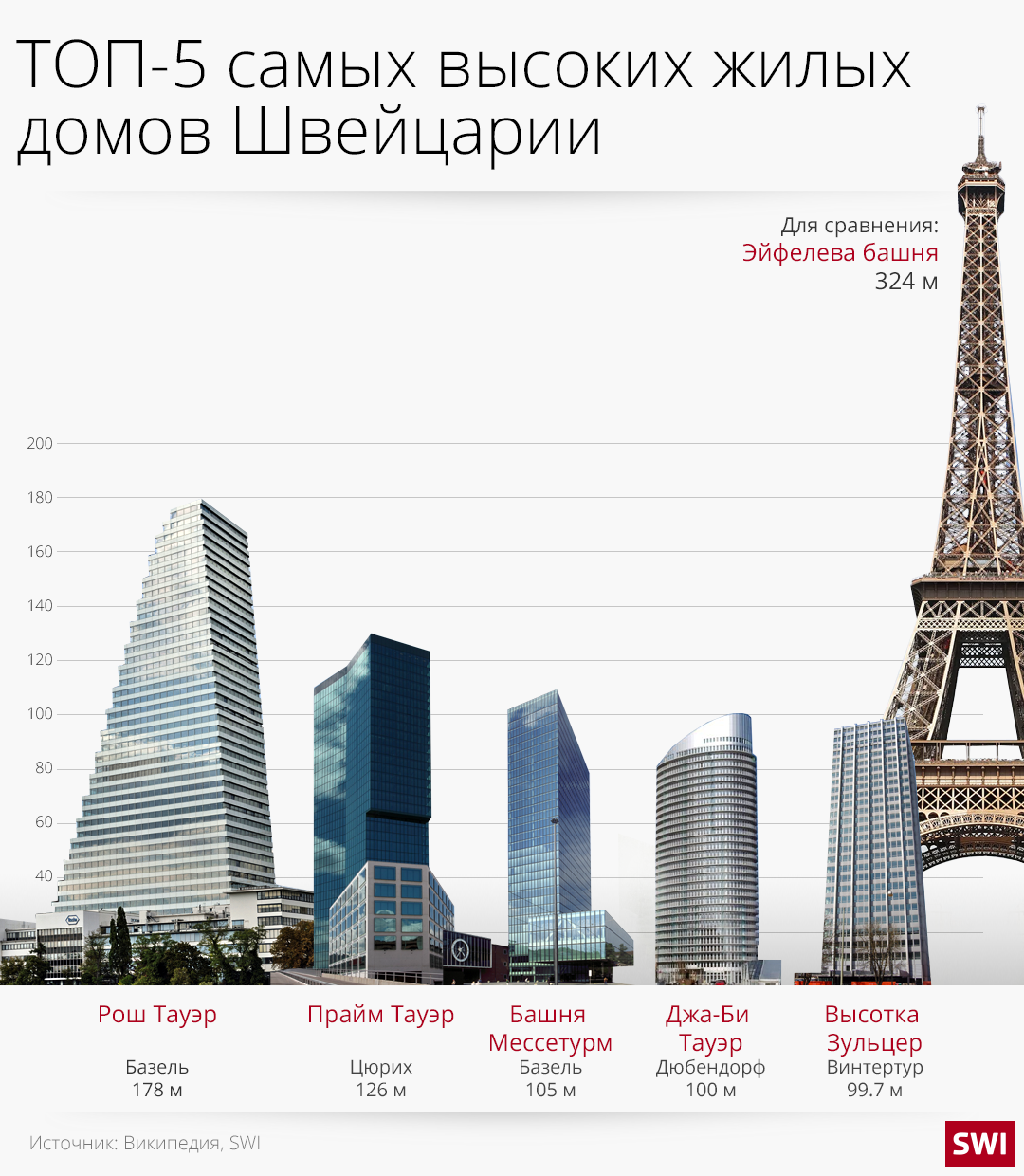 Кстати, а что такое «высотка» по швейцарским СНИПам? Какого-то общего определения тут нет, но в большинстве кантональных нормативных строительныхВнешняя ссылка и противопожарныхВнешняя ссылка документах высотным считается дом от 30 метров.