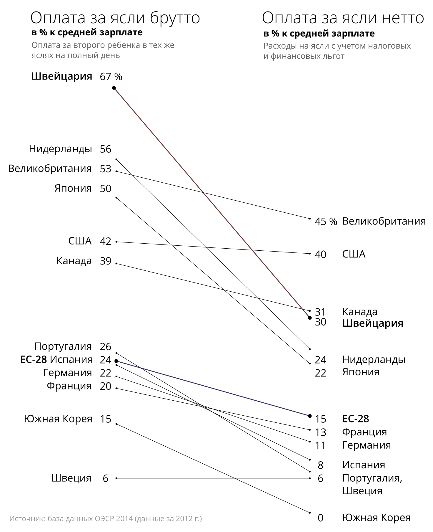 Международные исследования, а среди них и завершенное недавно банком HSBC исследование проблем экспатов за рубежом, только лишний раз подтверждают это, указывая, что в среднем семья, желающая, например, поместить своего ребенка в ясли на полный день, должна отдавать на это до двух третей месячной зарплаты одного из родителей. В результате среди развитых стран-членов ОЭСР Швейцарии принадлежит сомнительный рекорд в сфере стоимости внесемейного ухода за детьми.