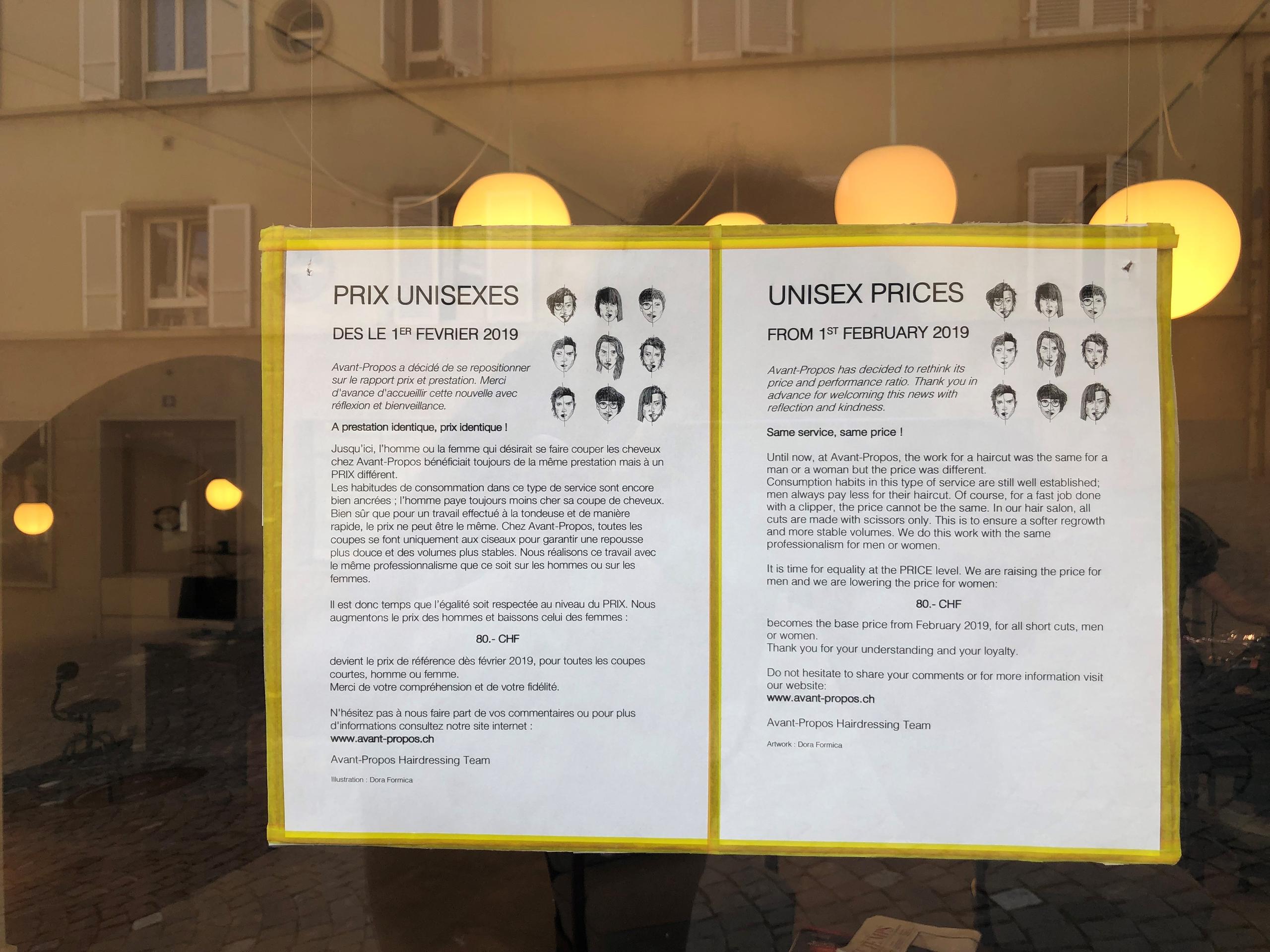 «Тарифы „унисекс“ с 1 февраля. Настало время соблюдать гендерное равенство и в области ценообразования», — гласит объявление в витрине парикмахерского салона Avant-Propos в Лозанне. Так клиента вводят в курс дела еще до того, как он войдет внутрь: еще на улице он знает, что в этой парикмахерской к нему с точки зрения цен за услуги отнесутся одинаково, независимо от того, мужчина клиент или женщина. «Цена стрижки у нас определяется длиной волос», — объясняет парикмахер Николя Сетту (Nicolas Cettou).