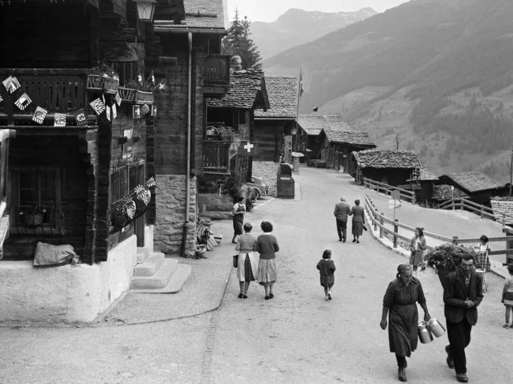 Деревня Грименц (Grimentz) в долине Анивье (Айфишталь), где Аделин начала свою карьеру в качестве акушерки. Снимок сделан в 1956 году. Keystone