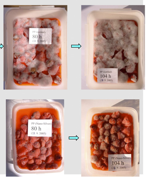 Наносеребро, диоксид титана или оксид цинка замедляют рост бактерий в продукте, продлевая тем самым срок его годности и свежести.