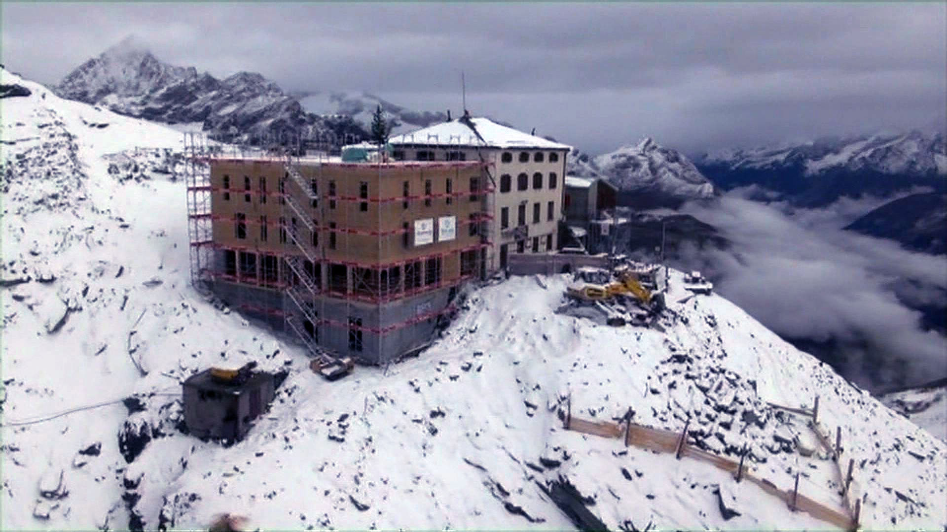 Прогуливаясь по окраине Церматта, почти неизбежно наткнешься на какой-нибудь строительный проект, находящийся в той или иной степени готовности. Здесь, где квадратный метр площади стоит огромных денег, роскошные шале порой возводятся прямо на крутых склонах. На одну из таких строек набредаем и мы. Строительный кран, медленно вращающийся из стороны в сторону, напоминает великана, размахивающего руками.