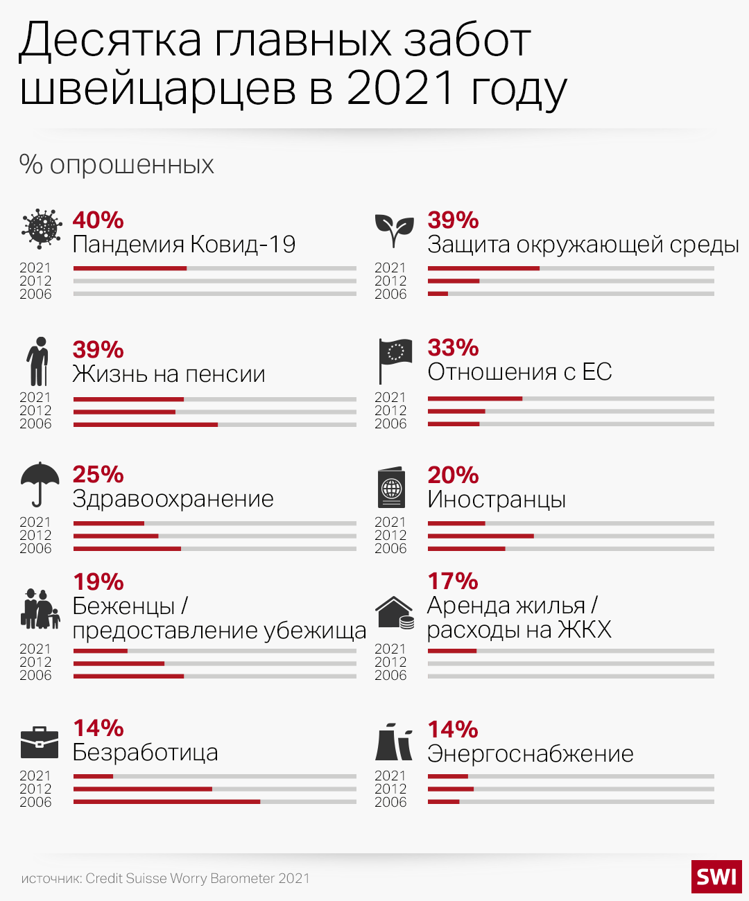 Когда швейцарцев спросили о самой, с их точки зрения, неотложной проблеме, требующей немедленного решения, самым распространенным ответом на этот вопрос была «пандемия Ковид и ее последствия» (20%). За ней следовала защита окружающей среды и противодействие негативным последствиям изменения климата (18%). «Пандемия коронавируса», которая в прошлом 2020 году сразу заняла первое место в «Барометре тревоги нашей», теперь явно делит свое лидерство еще с двумя другими проблемами (климат, пенсии).