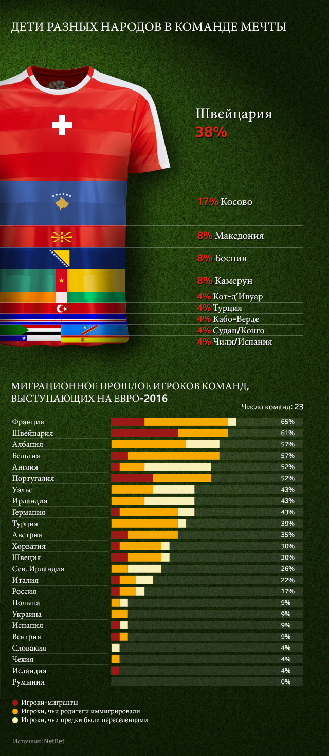 Если учитывать тренерский состав, то у Швейцарии и Франции окажутся команды с одинаковым количеством спортсменов с «миграционным прошлым» — по 15. При этом, по данным букмекерской онлайн-конторы NetBet, за Швейцарию выступает в два раза больше игроков, которые родились за границей, чем за Францию.