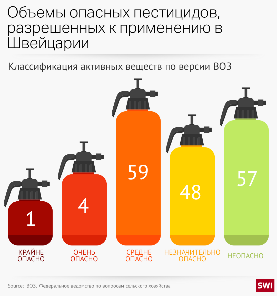 Итак, в международном сравнении Швейцария и в самом деле середняк там и тогда, где и когда речь идет о продаже пестицидов и об ограничении в области их использования. Однако и власти, и левые партии охотно скрывают тот факт, что в области динамики сокращения использования некоторых особенно опасных видов пестицидов (например, гербицидов) страна добилась куда большего прогресса, чем это готовы признать сторонники запретов всего и вся. Пестициды, разрешенные к применению в Швейцарии, как правило, отнюдь не самые токсичные, более того, около 40% продаваемых в стране пестицидов вполне можно использовать даже в так называемом биоорганическом сельском хозяйстве.