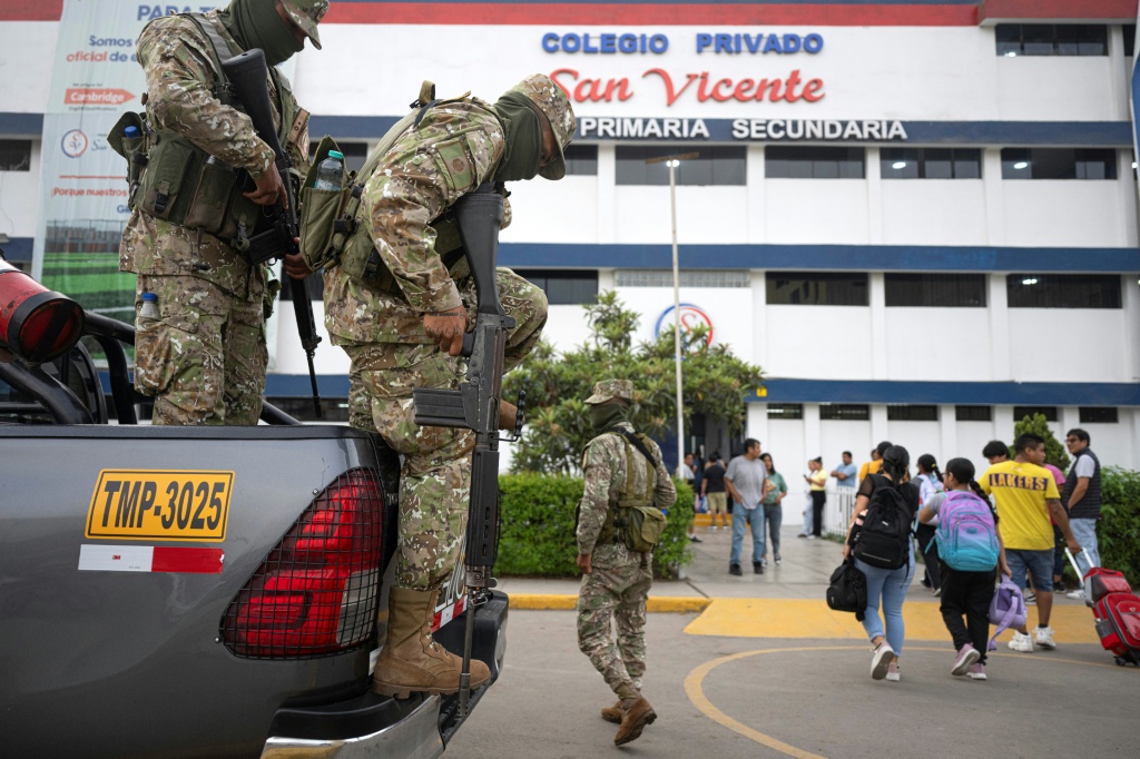 La temporada escolar comenzó hace un mes, pero solo ahora los padres pueden llevar a sus hijos a este colegio de Lima atacado con explosivos por negarse a pagar una extorsión. En la entrada, en vez de profesores, vigilan militares con fusiles.