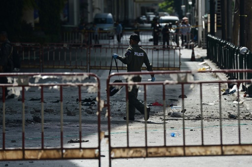 Un policía acordona la zona en la que ha estallado una bomba, a las puertas del popular santuario de Erawan, en Bangkok, el 18 de agosto de 2015 afp_tickers