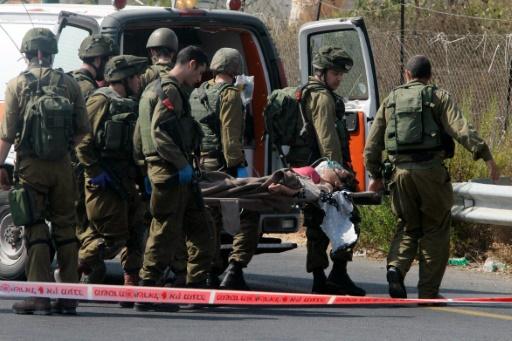 Soldados israelíes transportan a la palestina herida Raghad Khadour, una de las dos atacantes que chocaron su coche contra una parada de bus el 16 de septiembre de 2016 cerca de Kiryat Arba, en la Cisjordania ocupada afp_tickers
