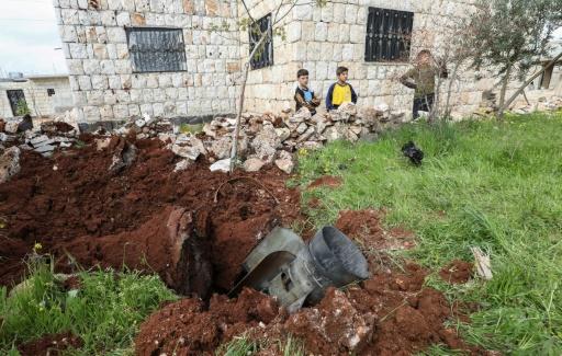 Tres niños permanecen junto al cráter abierto por una bomba cerca de una casa alcanzada por el bombardeo de Kafranbel, pueblo en manos rebeldes situado en la provincia de Idlib, este jueves 4 de abril al noroeste de Siria afp_tickers