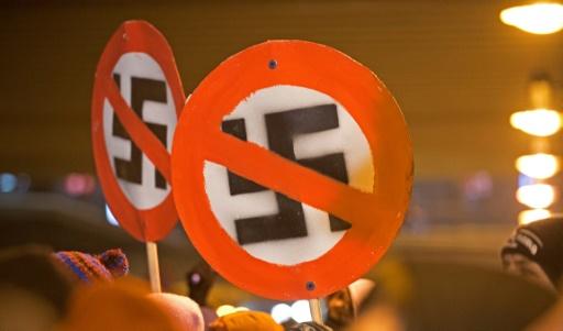 Manifestantes de izquierda sostienen carteles con esvásticas tachadas para protestar contra una marcha de la extrema derecha en Dresde, Alemania, el 13 de febrero de 2013 afp_tickers
