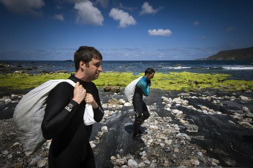 Con sus trajes de neopreno, Alberto, Sergio y María nadan entre las algas, recogiendo estas verduras del mar que luego procesarán en su factoría de Ortigueira, en La Coruña, con la que buscan su propia salida a la crisis económica.